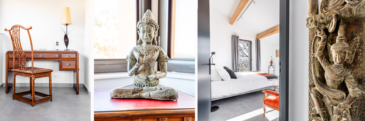 The décor of the mas is a refined interplay between contemporary design and the authenticity of Asian artistry. Clean lines and raw, natural materials create a space imbued with both elegance and serenity. A sofa designed by a renowned French creator, vibrant European armchairs, and a rustic table handcrafted by a local blacksmith coexist effortlessly with rare and storied pieces, each infused with deep cultural significance and spirituality.