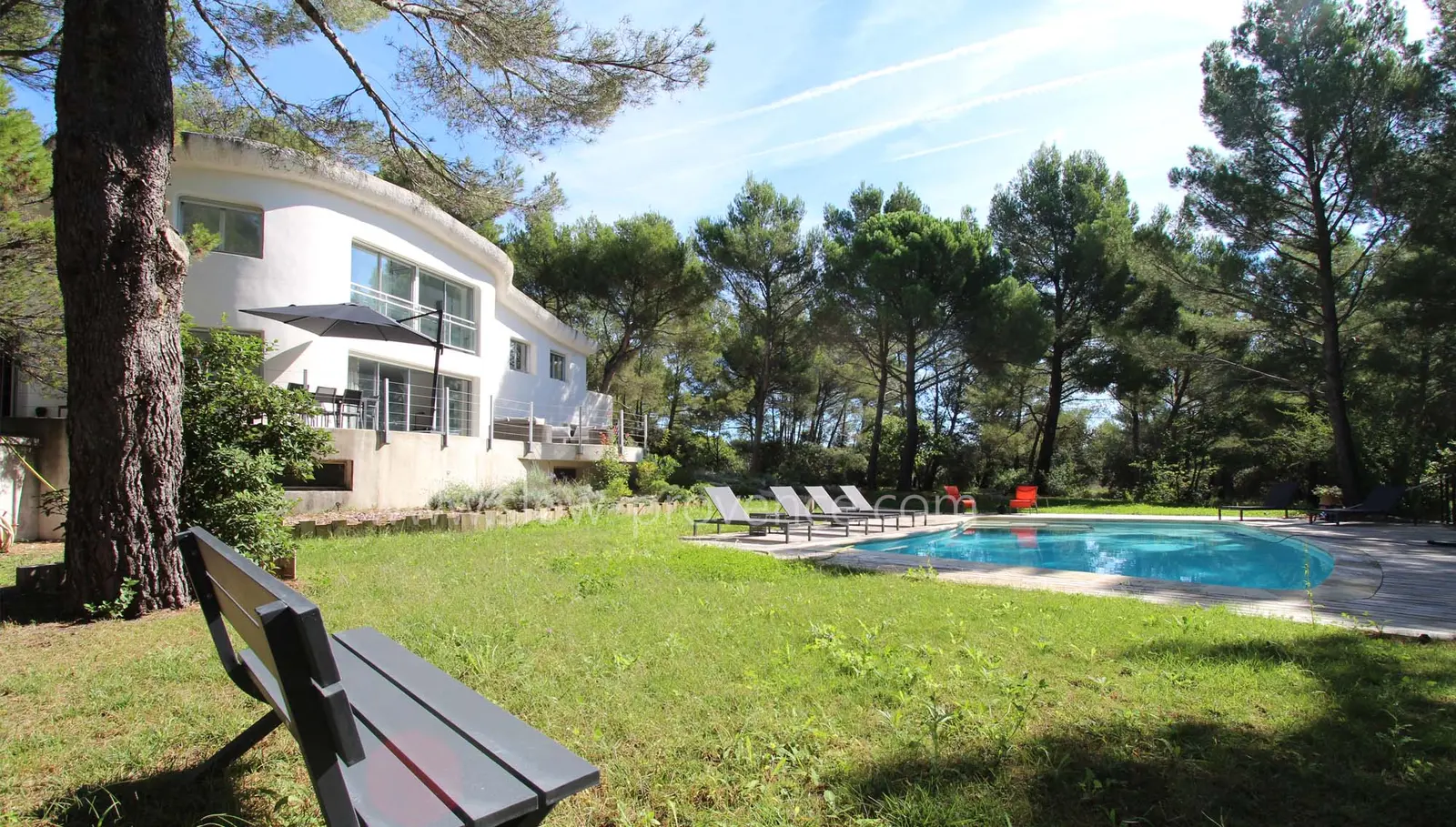 The Villa Calanque is a uniquely styled architectural residence designed by Jean Balladur in the 1970s. Built entirely of plaster with graceful curves, it features an interior with a distinctive design, accented by vintage decor pieces. Nestled in the heart of a vast pine forest, the villa is surrounded by an expansive, lush garden—a true haven of tranquility. Located between Pernes-les-Fontaines and Carpentras in Provence, the villa not only offers its immense garden and private pool but also four spacious bedrooms, each with its own private bathroom, and fully air-conditioned spaces for optimal comfort.
