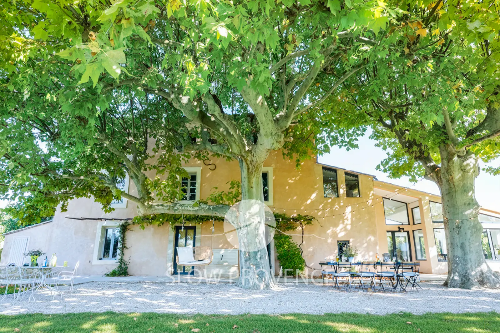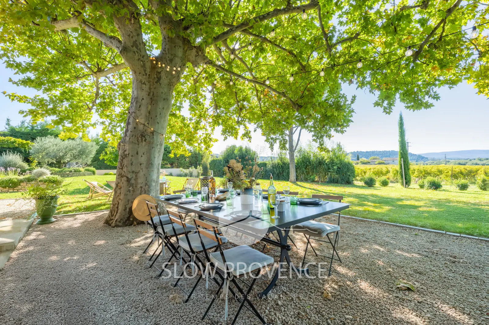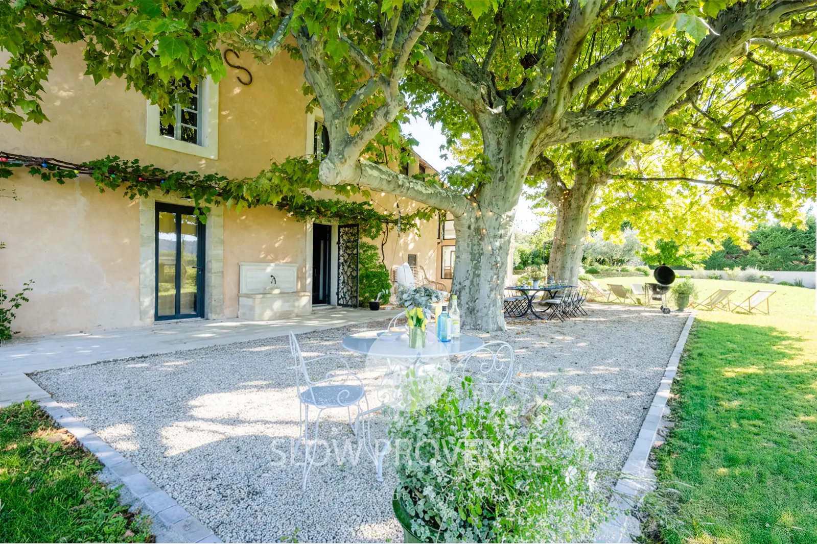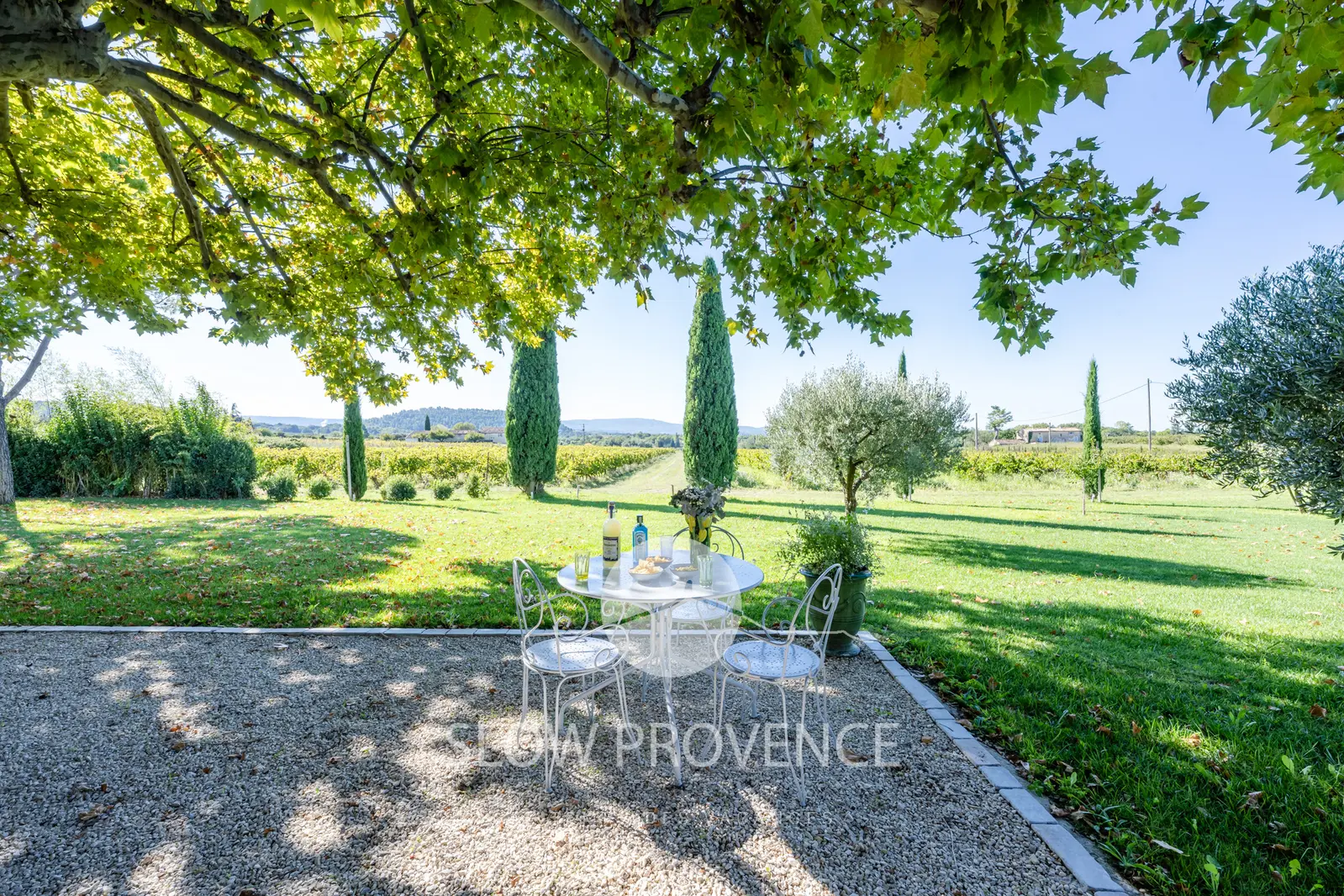 - Terrace shaded by two century-old plane trees: table and chairs for 10; view over the vineyards;
