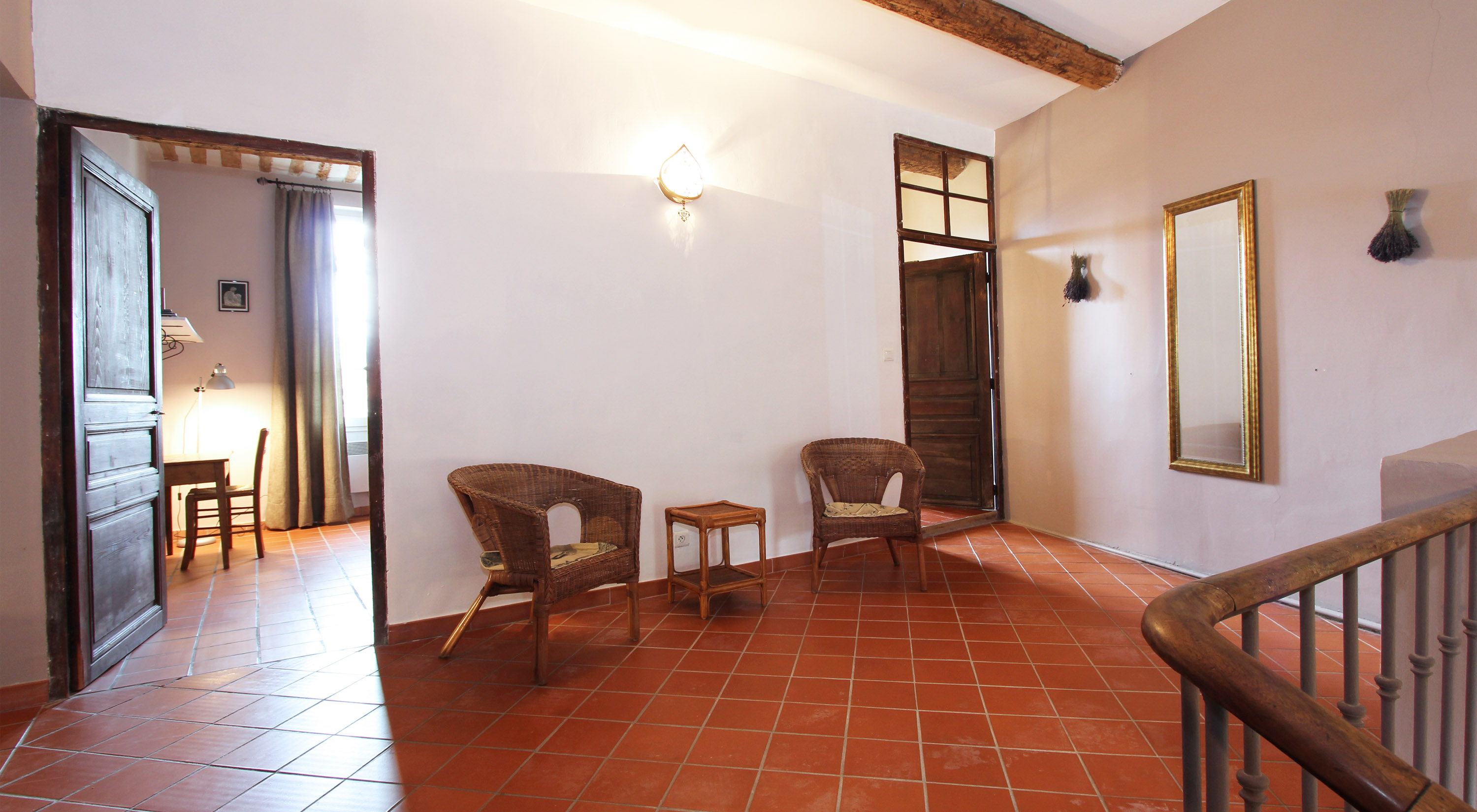 - Large staircase with door to garden and pool, landing with two armchairs and table;