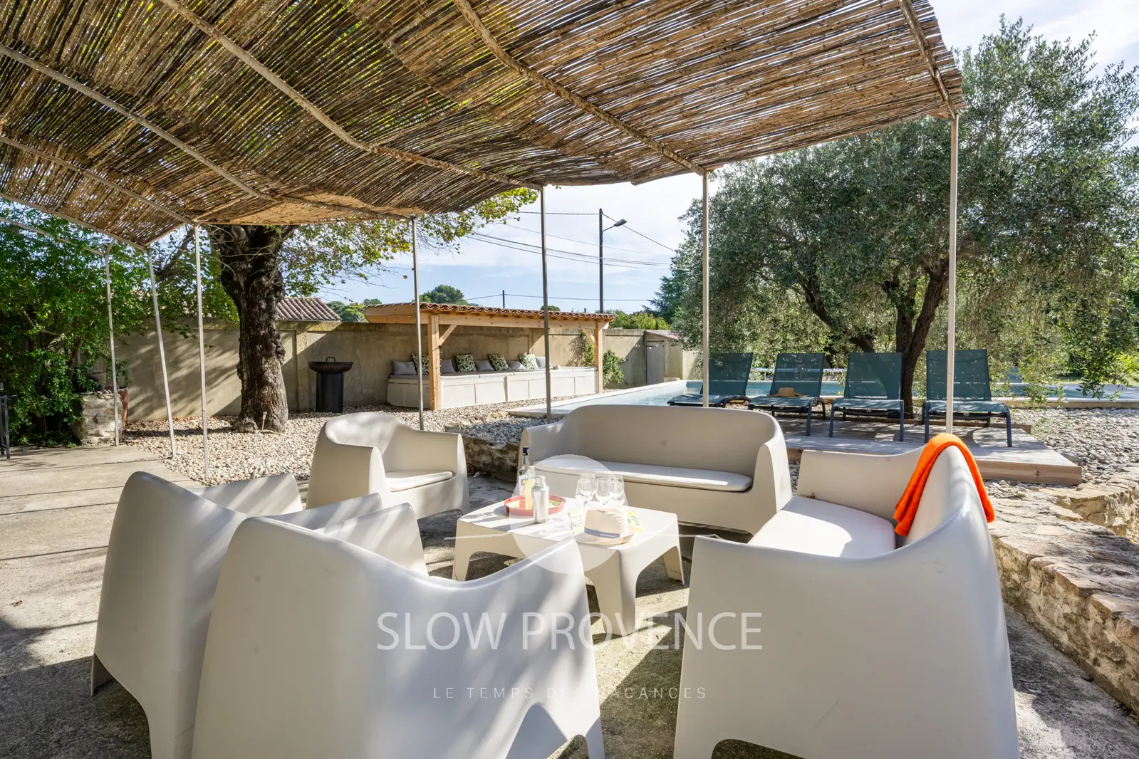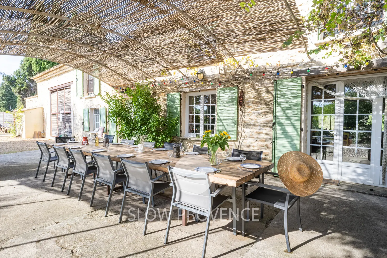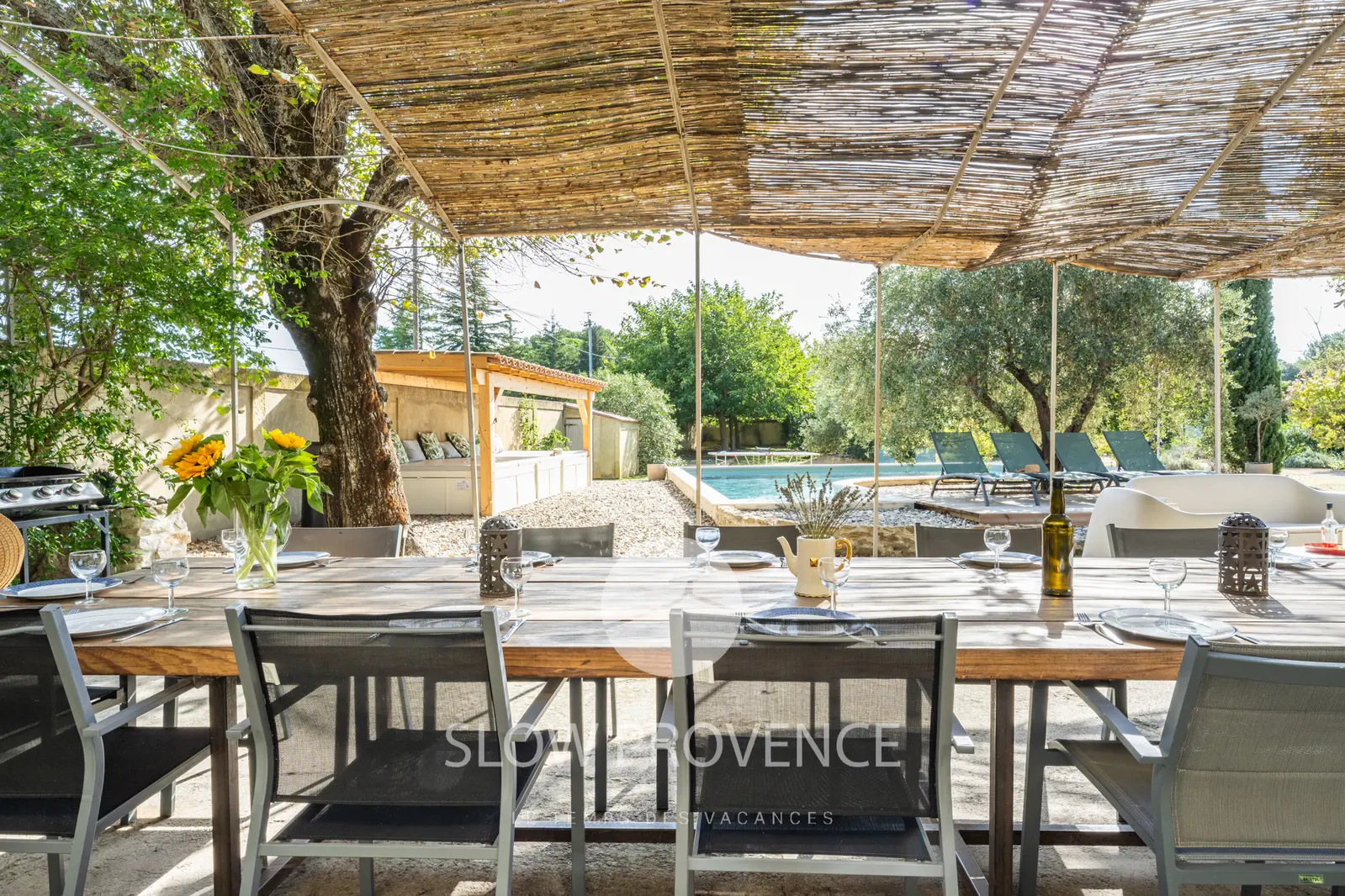 - Shaded terrace covered by a "canisse" arbor: large table, 15 chairs; Garden furniture: 2 sofas, armchair, coffee table;