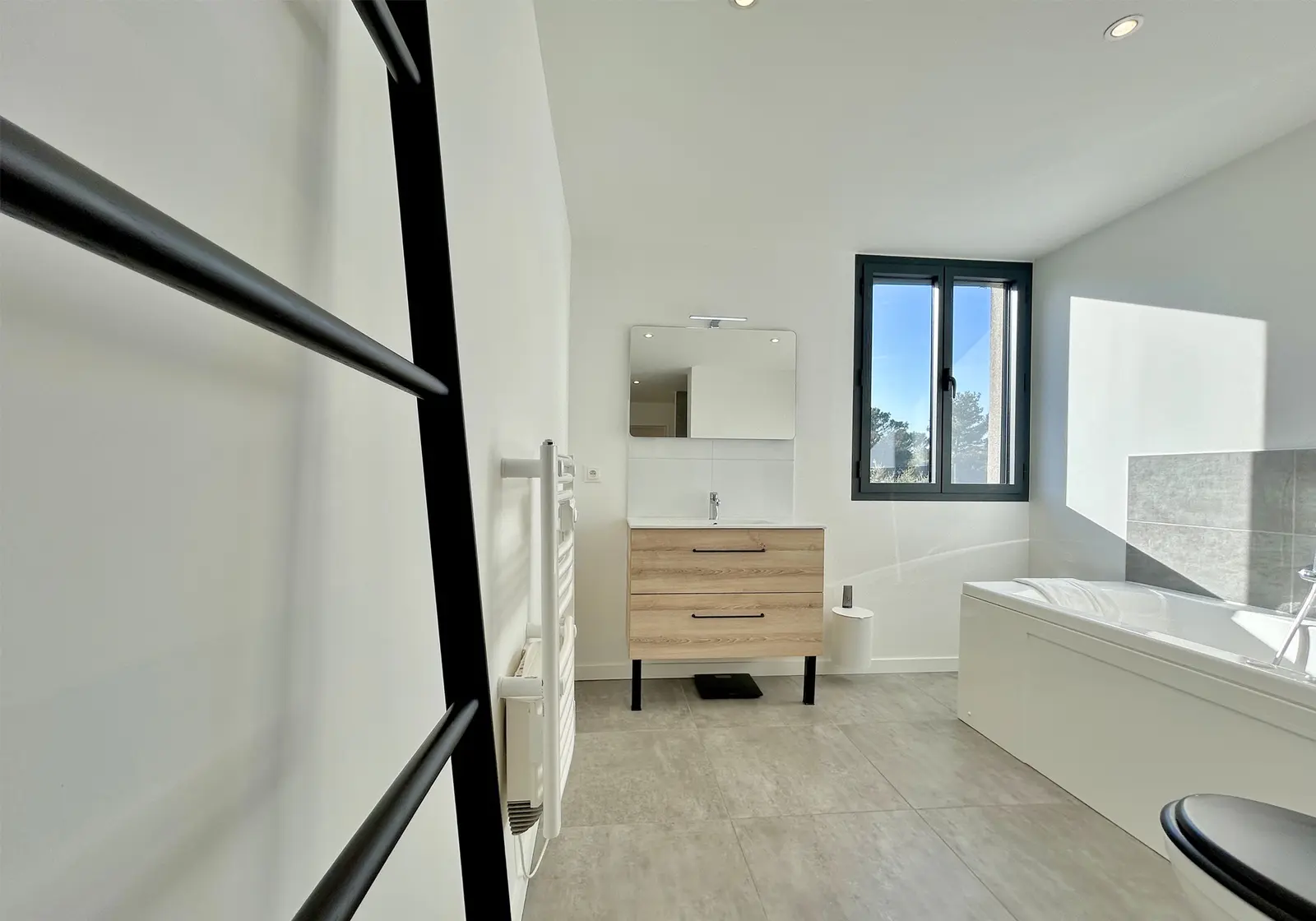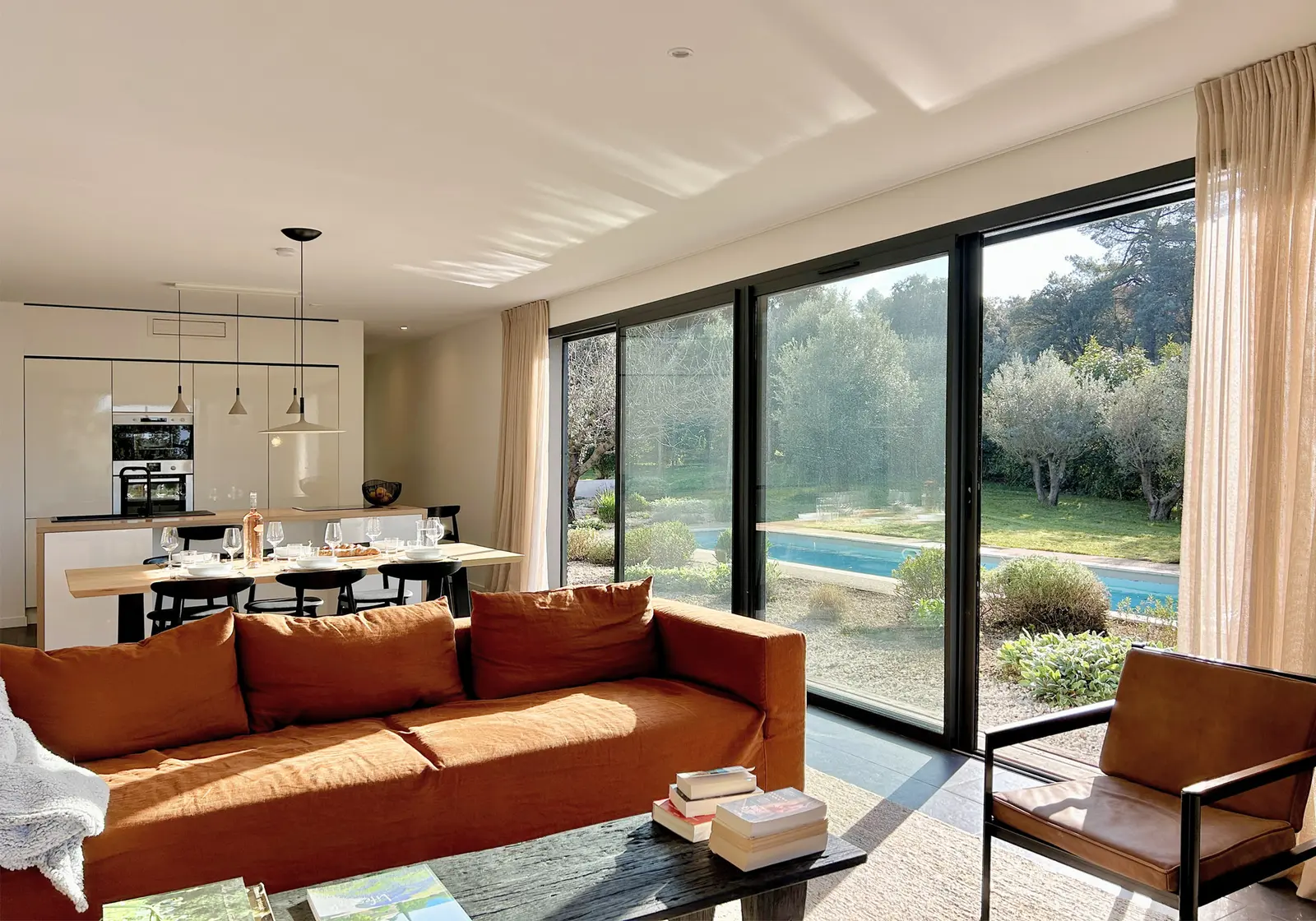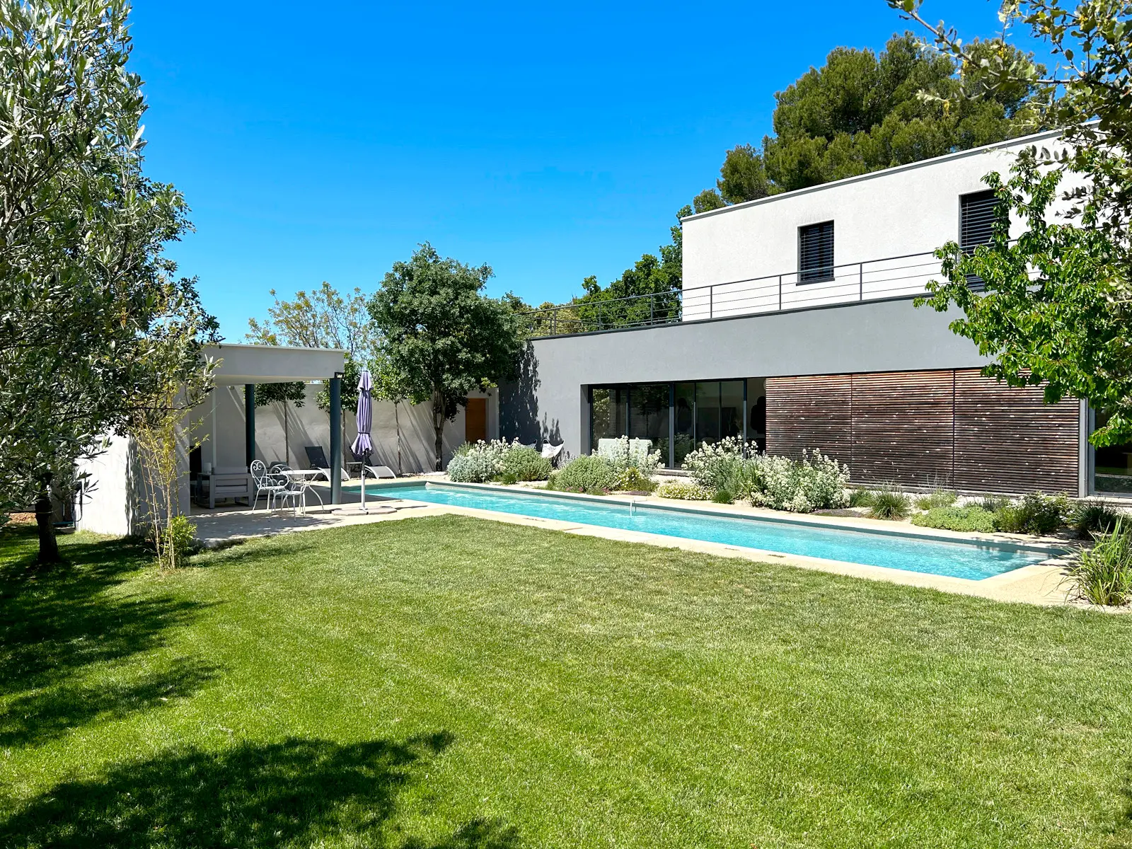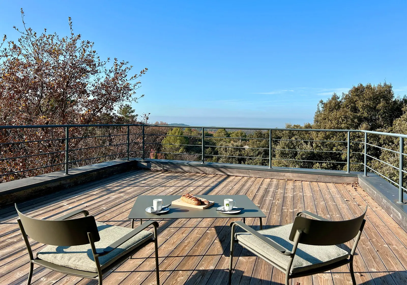 Villa Venasque is a contemporary architect-designed villa located on the heights of the medieval village of Venasque, listed among the “Most Beautiful Villages of France.” Surrounded by oak woodland, the villa enjoys a privileged natural setting, very peaceful and ideal for relaxation. Its multiple terraces on either side of the house, along with its private swimming pool, invite you to unwind. Inside, the modern, uncluttered spaces with minimalist décor open widely onto the outdoors, allowing you to enjoy views of nature and the Provençal light in every season.