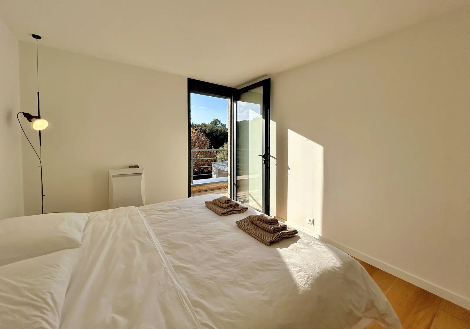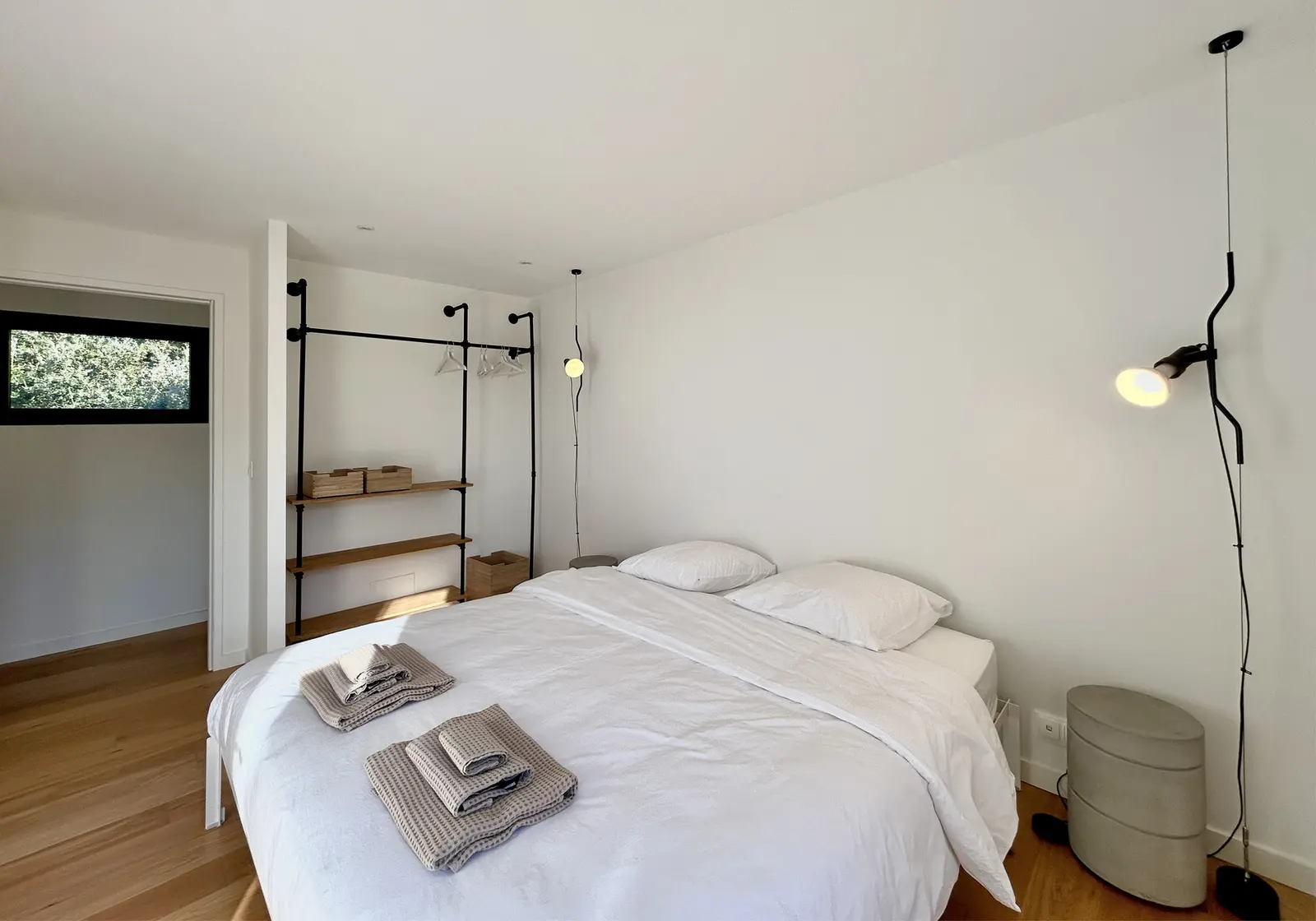 - Bedroom 3 (15.5m²): double bed (180 x 200 cm), open wardrobe, air conditioning; access to a private 30 m² terrace with panoramic views, furnished with a coffee table and 2 chairs