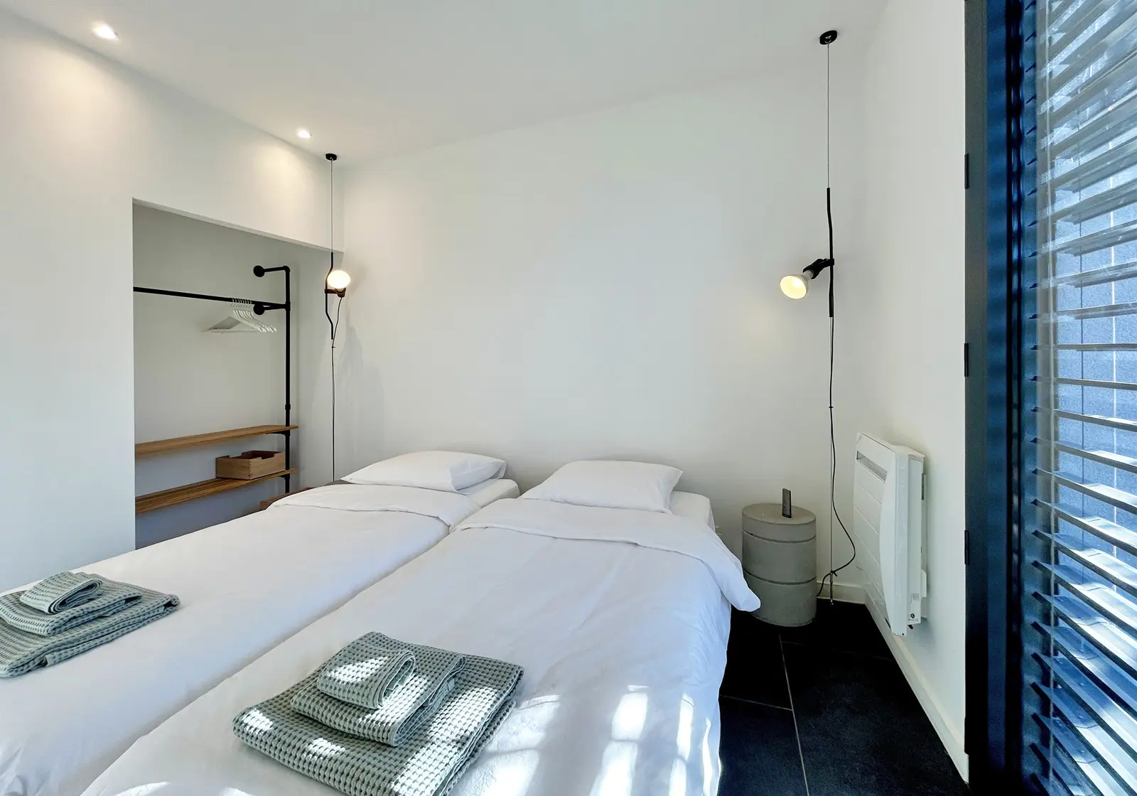 - Bedroom 1 (9.5m²): 2 single beds (2x90x200cm) or double bed (180x200cm), open wardrobe;