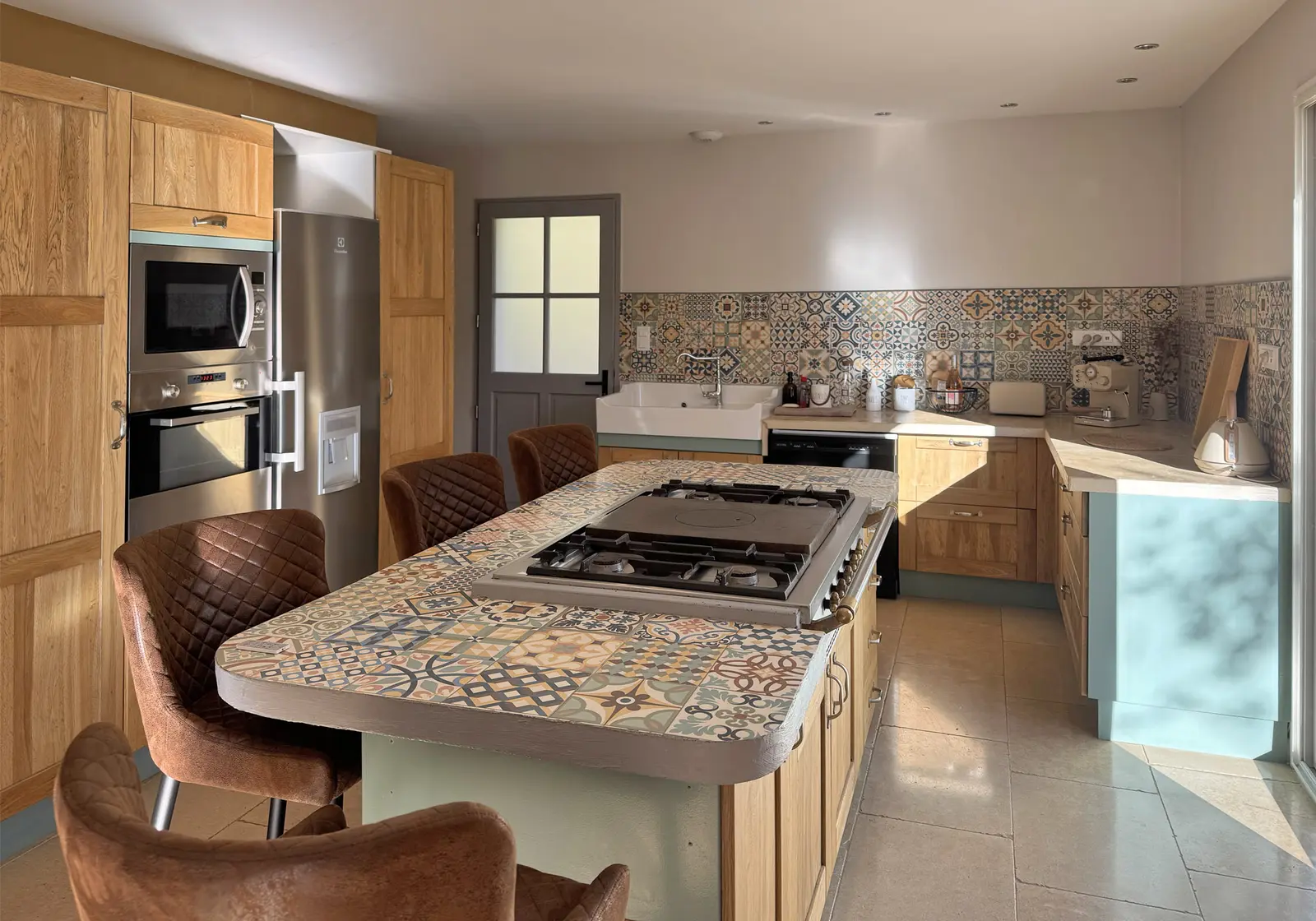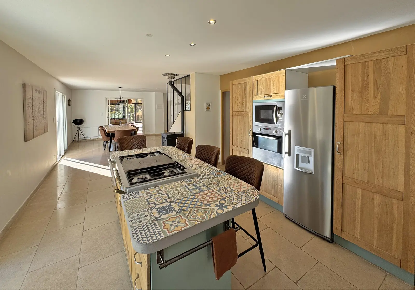 - Cuisine : évier, lave-vaisselle, cafetière italienne, bouilloire, grille-pain, réfrigérateur, four, micro-ondes ; îlot central : plaques à gaz (4 feux), 4 tabourets ; accès terrasse ;