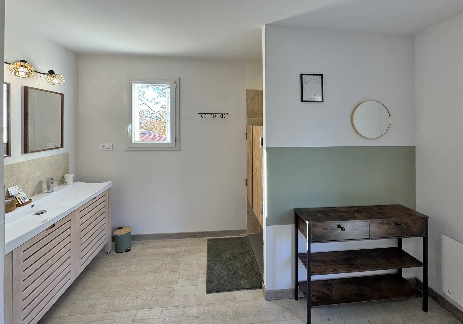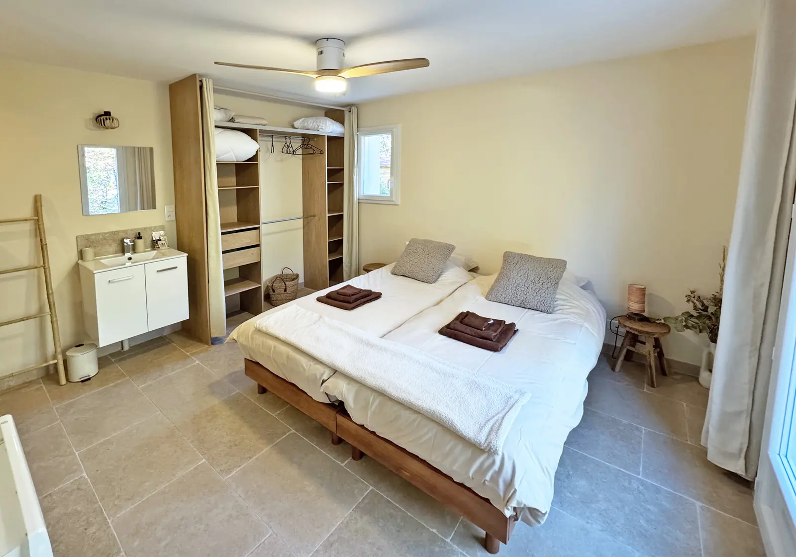 - Chambre 1 (15m²) : lit double (180x200cm) ou 2 lits simples (2x90x200cm), dressing ; accès jardin ; Salle de douche privative : douche à l'italienne, vasque, sèche-cheveux ;