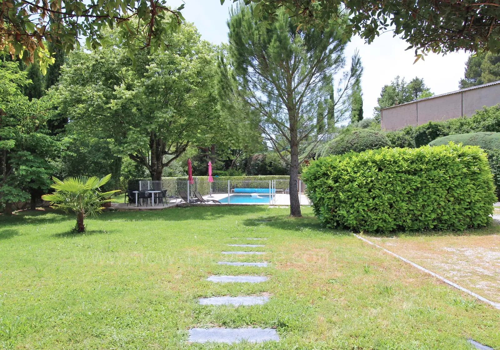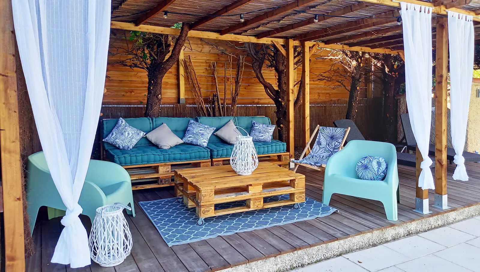 - Salon de jardin ombragé : fauteuils, table basse ;
