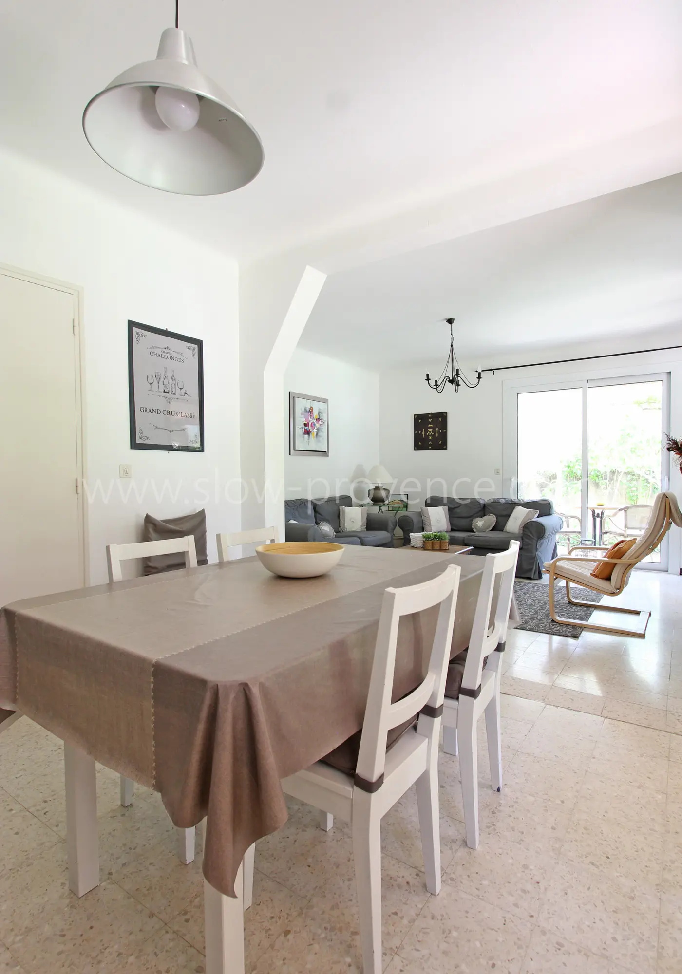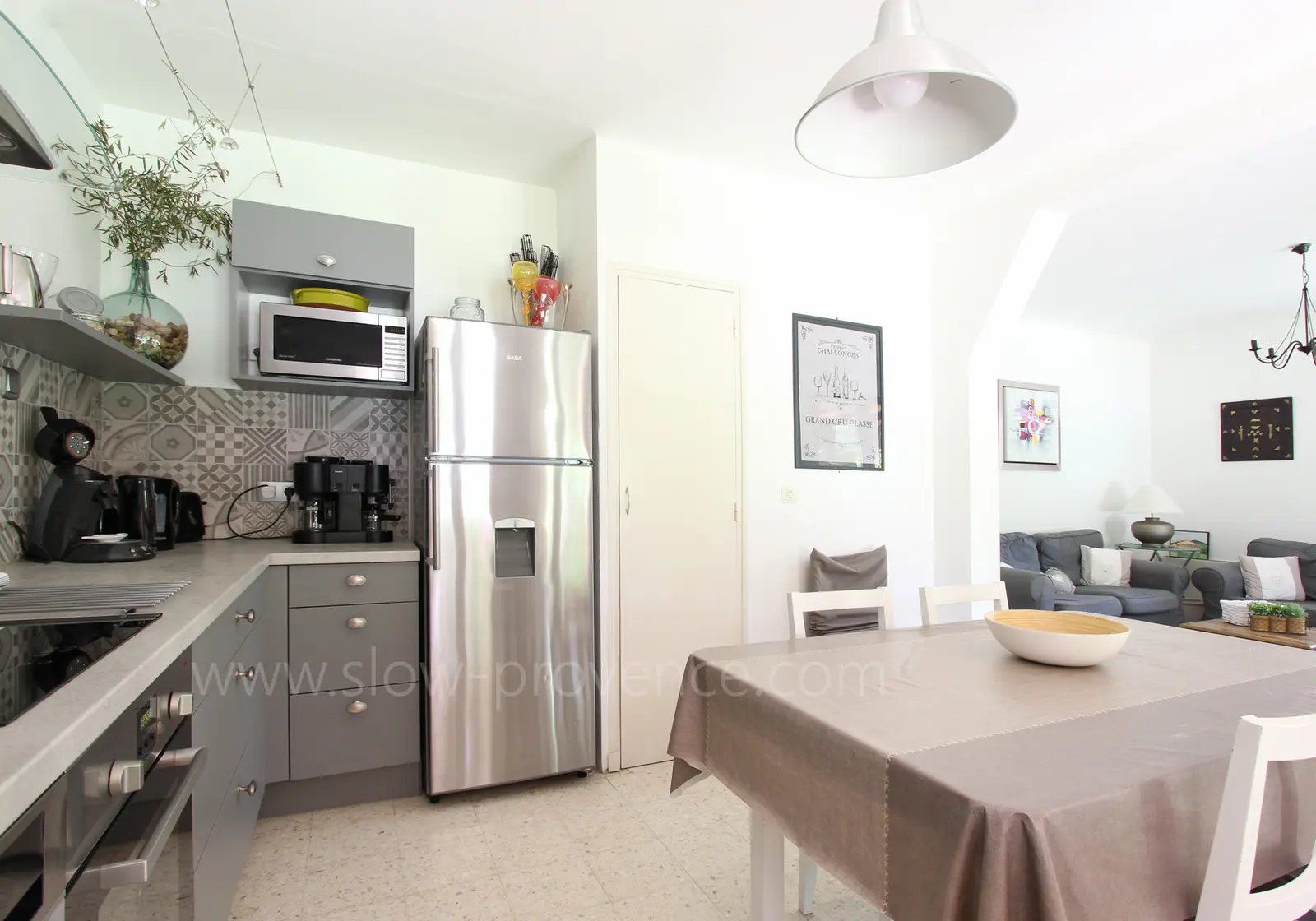 - Cuisine ouverte sur le séjour : plaques à induction (3 feux), four électrique, four à micro-ondes, réfrigérateur avec partie congélation, lave-vaisselle, cafetière combinée Krups + presse + Senseo, grille-pain, plans de travail, placards, évier, table et 6 chaises ; accès sur la terrasse ;