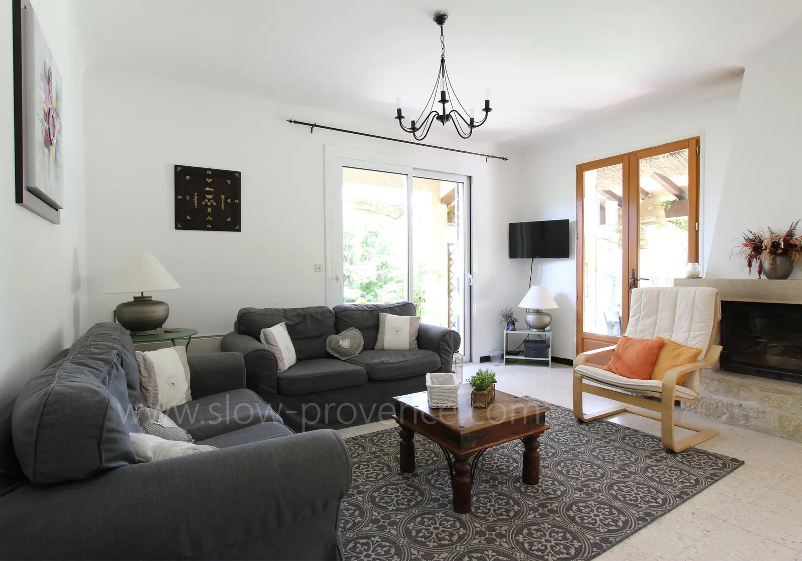 - Salon : 2 canapés, fauteuil, buffet, cheminée avec insert, TV ; accès terrasse ;
