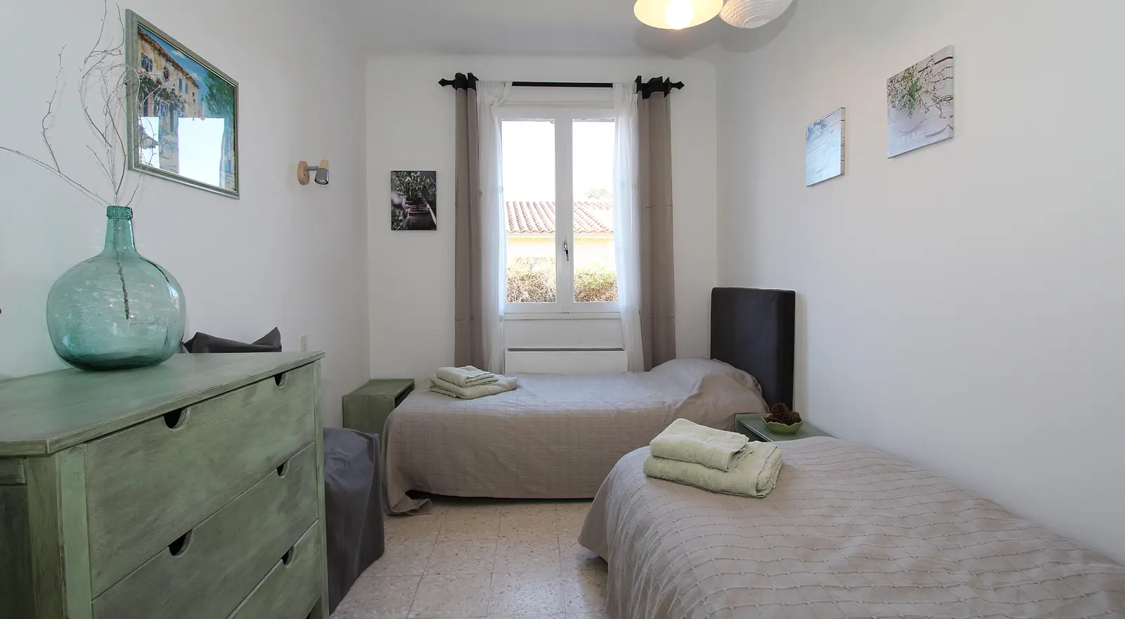 - Chambre 1 (9.5m²) : 2 lits simples (90x190cm), commode ;
