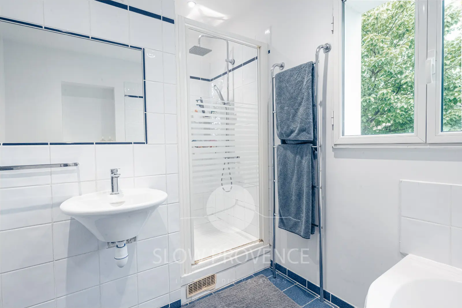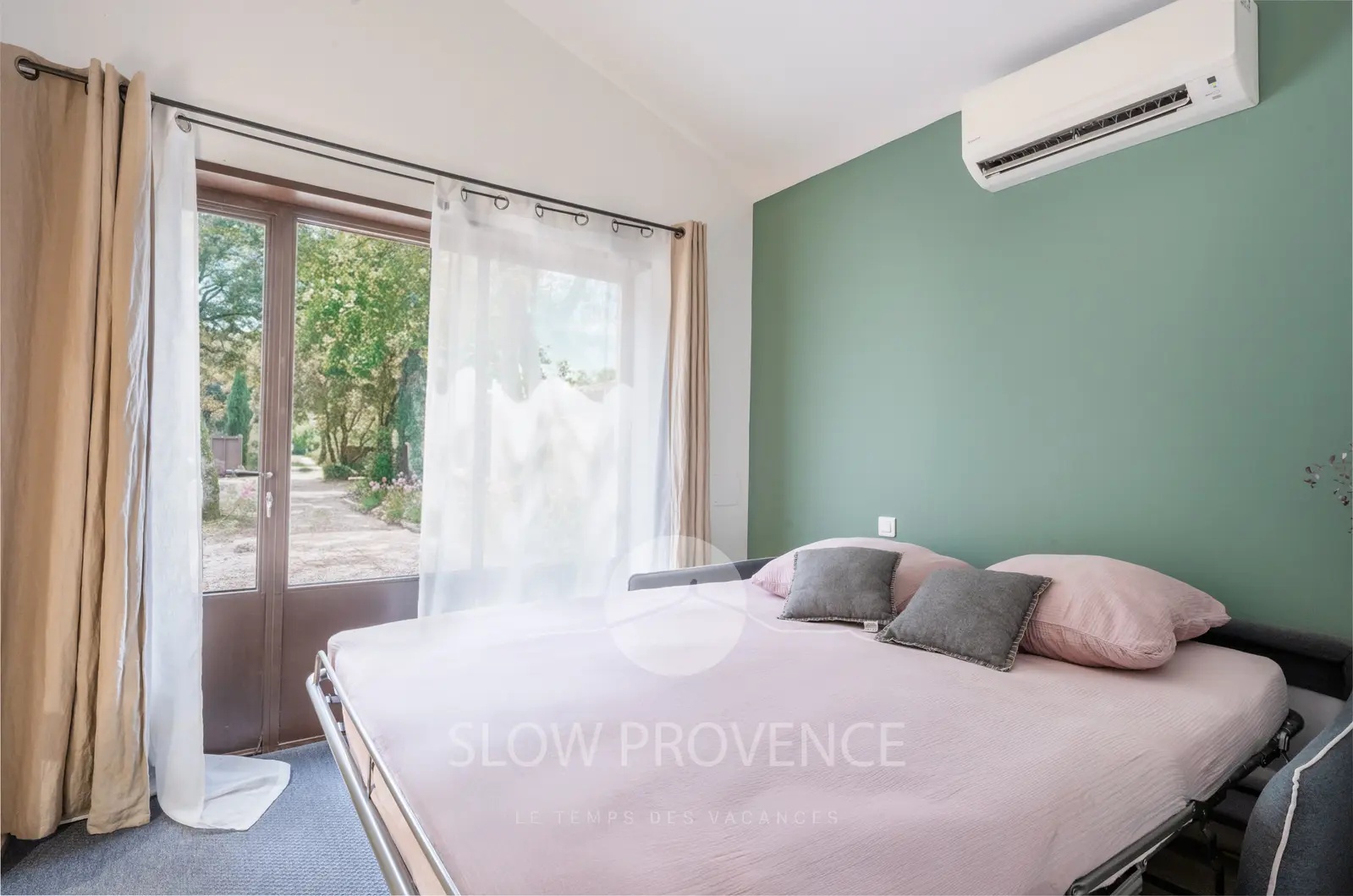 - Chambre 1 (12m²) : canapé convertible tout confort (160x200cm) ; Salle d’eau privative : douche à l'italienne, vasque, sèche cheveux, WC ; accès direct sur le jardin ;