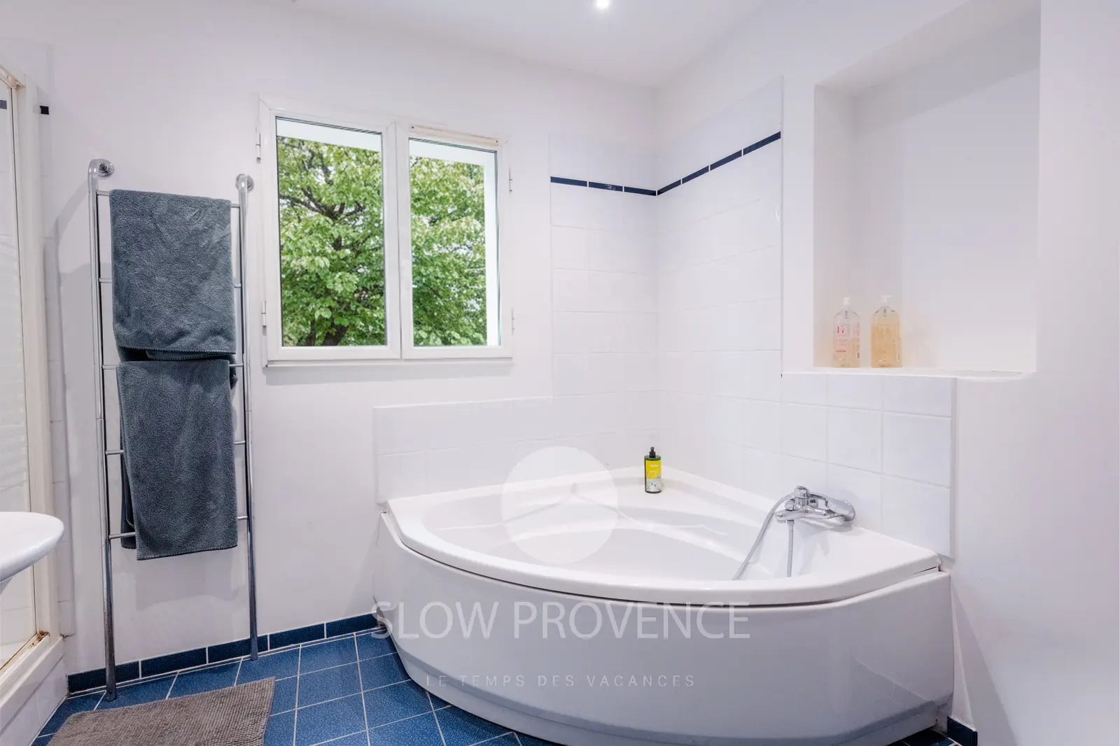 - Salle de bain partagée entre les chambres 3 et 4 : bac à douche, baignoire d'angle, vasque, sèche-cheveux ;