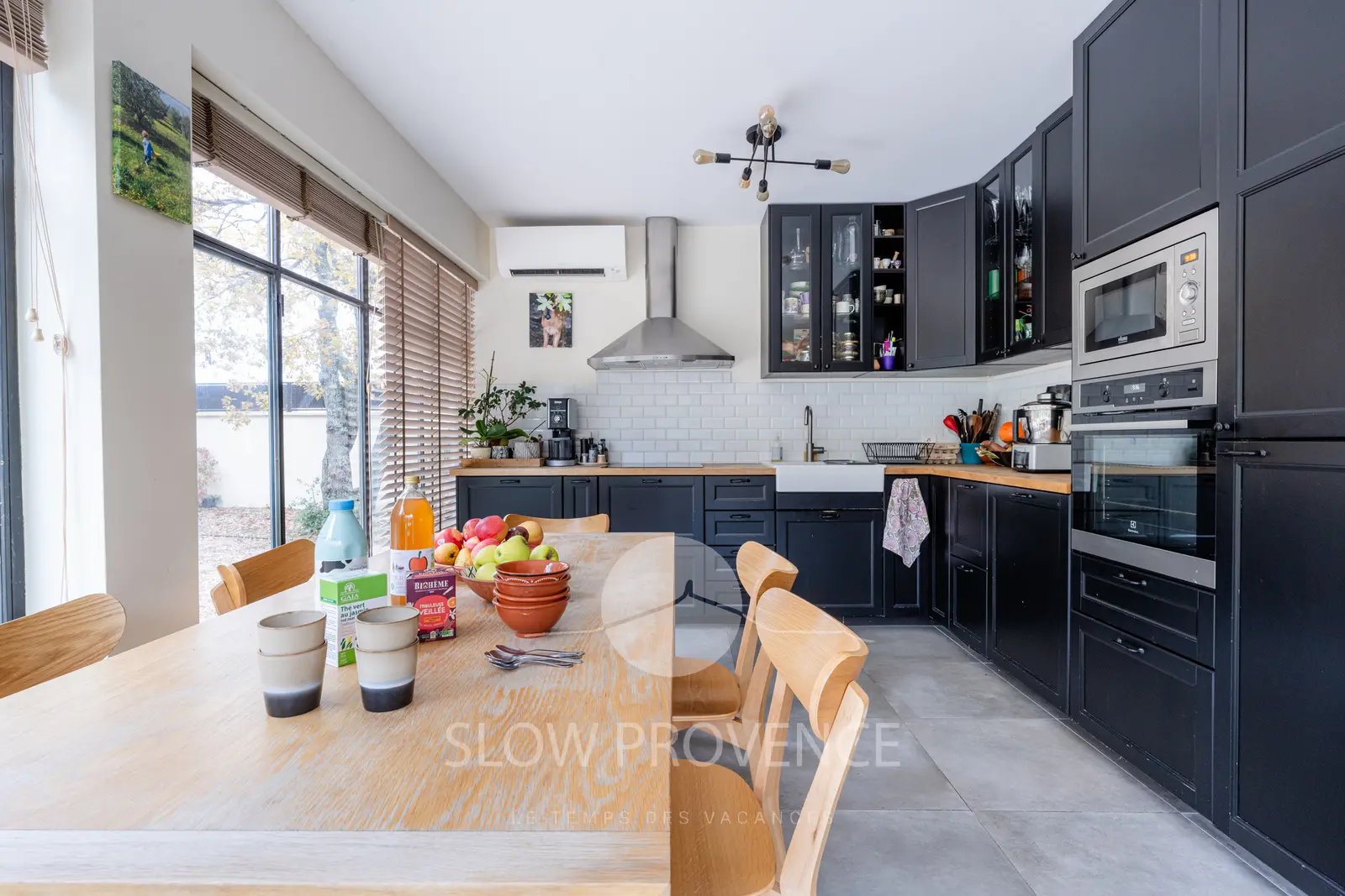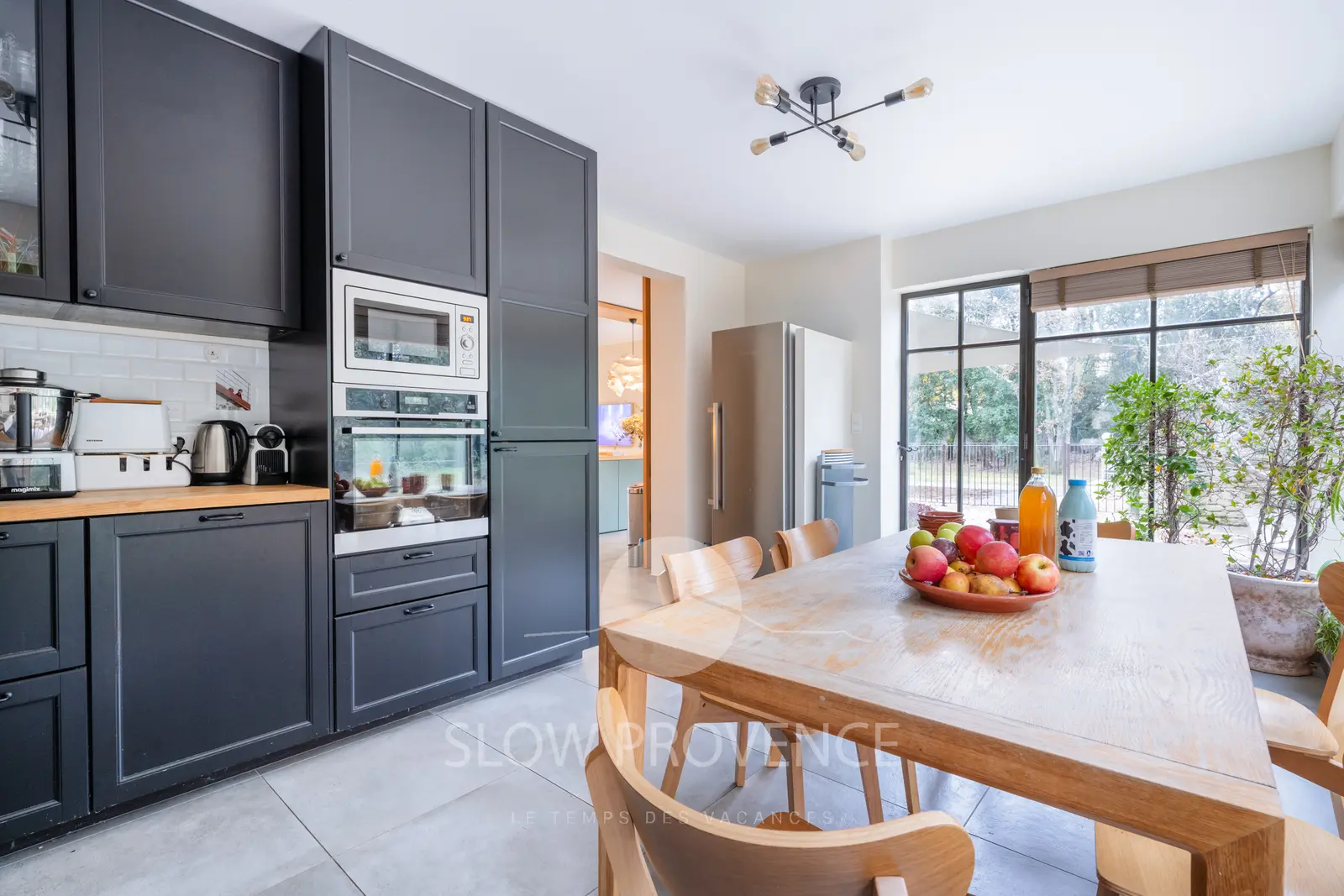 - Entrée par la cuisine : table et 6 chaises, plaques à induction (3 feux), évier,cafetière Nespresso, grille-pain, bouilloire, lave-vaisselle, four, micro-ondes, réfrigérateur ;