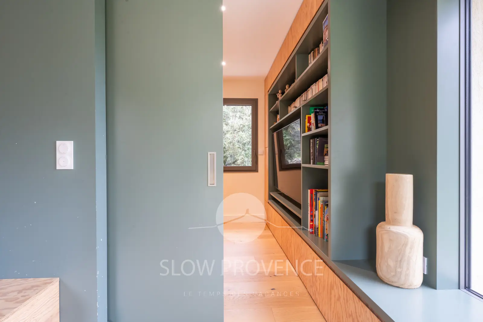 - Salon : grande TV, bibliothèque et banquette, jeux ; idéal pour les enfants ;