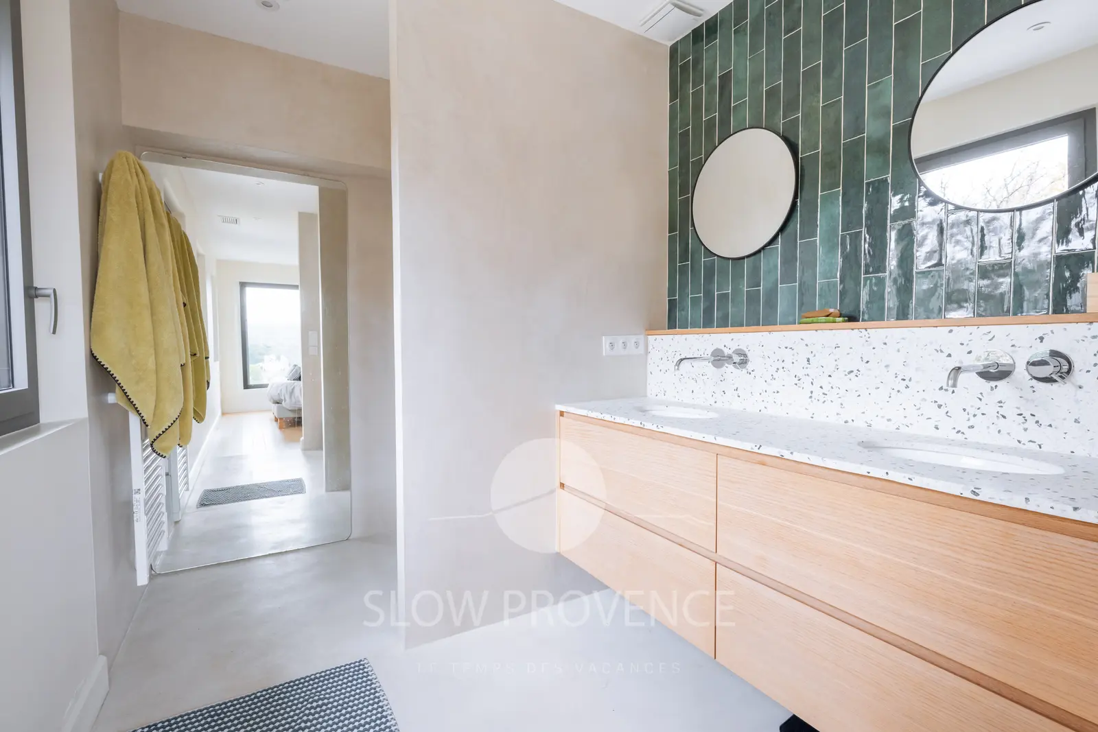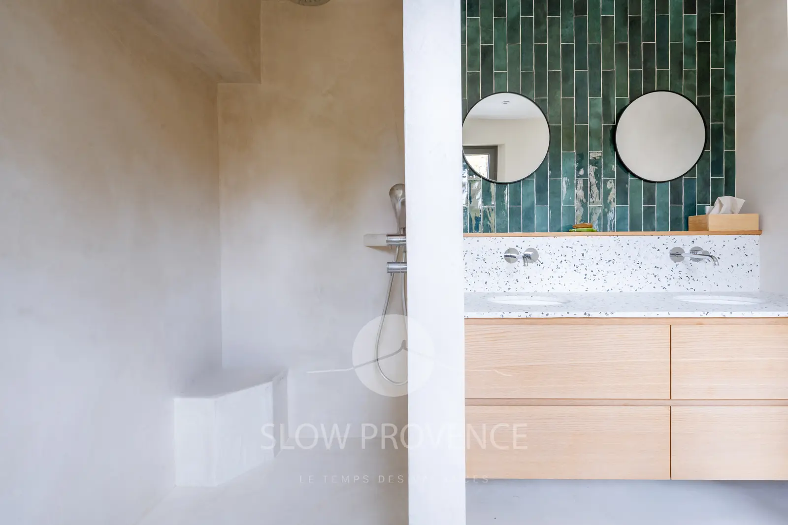 - Chambre 2 (suite parentale de 35 m²) : grand lit double (180x200cm) avec superbe vue sur le village perché du Beaucet ; grand dressing avec vue sur le Ventoux ; Salle de douche privative : grande douche à l’italienne, double vasque, sèche-cheveux, sèche-serviettes ;