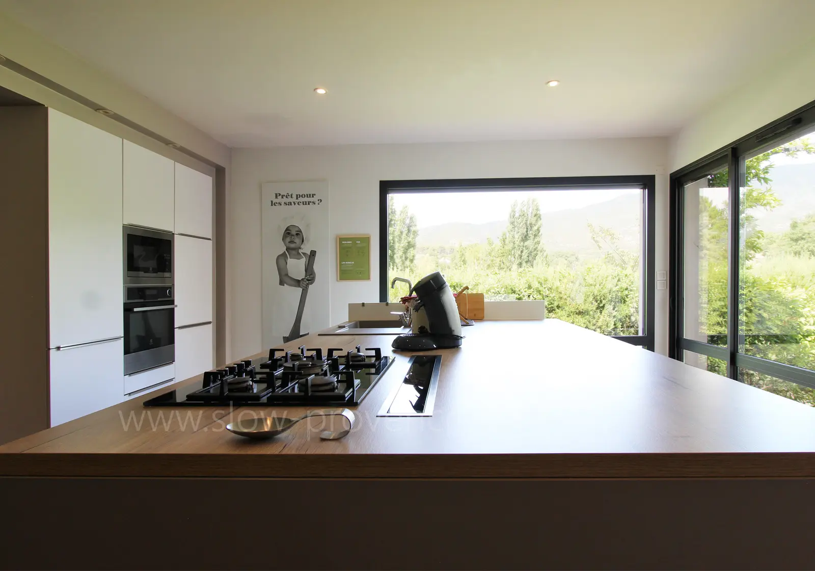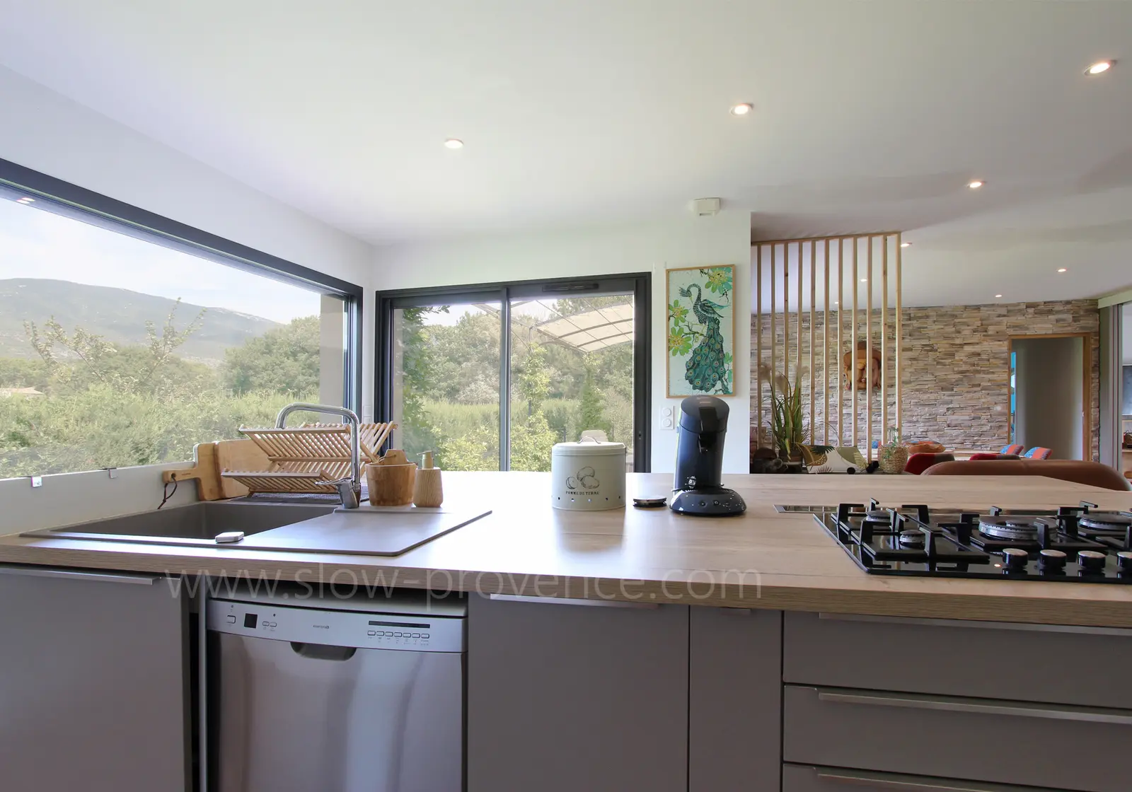 - Keuken : hoge tafel en 4 stoelen, spoelbak, vaatwasser, waterkoker, broodrooster, gaskookplaat (5 pitten), koelkast, vriezer, oven, magnetron, Senseo koffiezetapparaat;