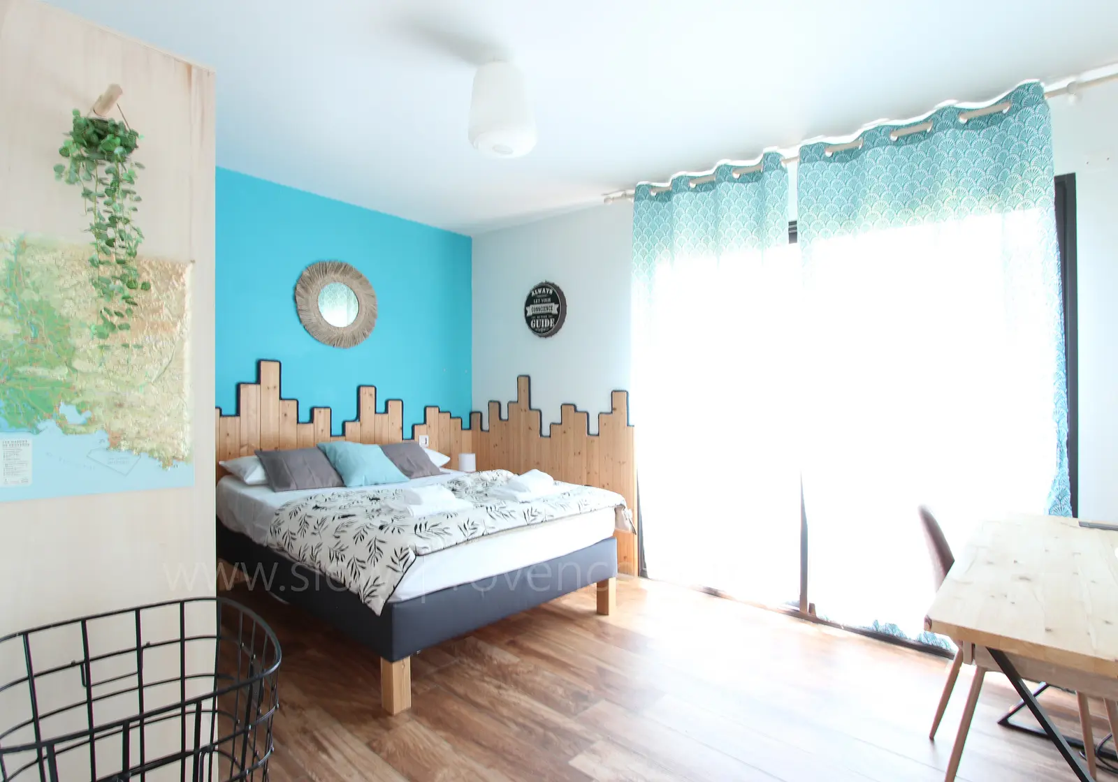 - Slaapkamer 1 : tweepersoonsbed (140x200cm), kleedkamer, bureau en stoel; toegang tot de tuin;