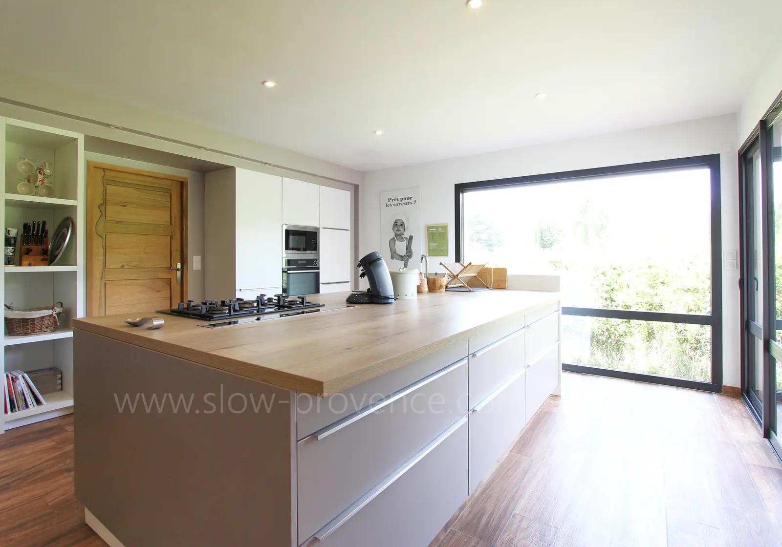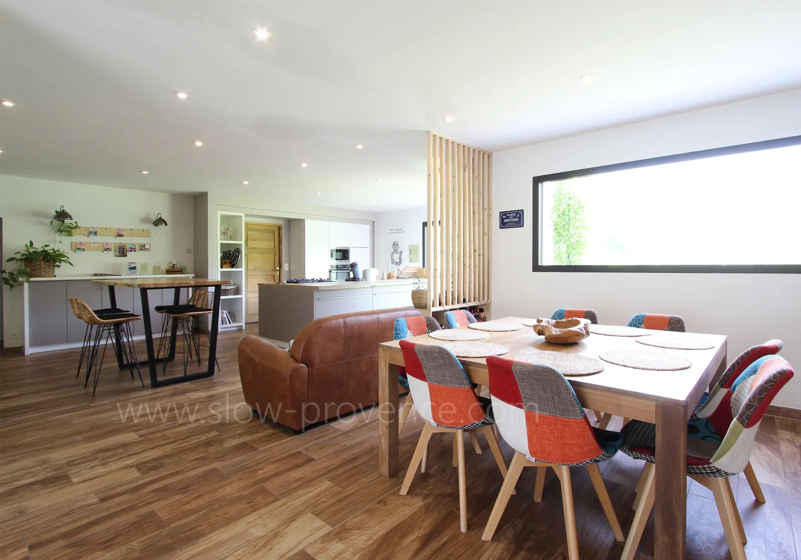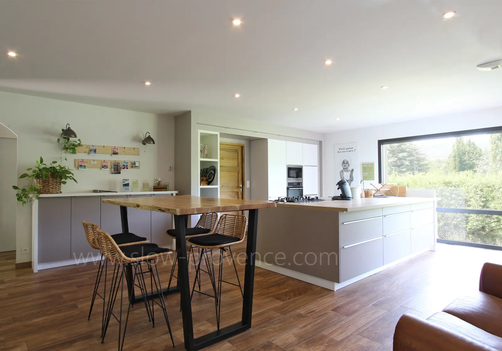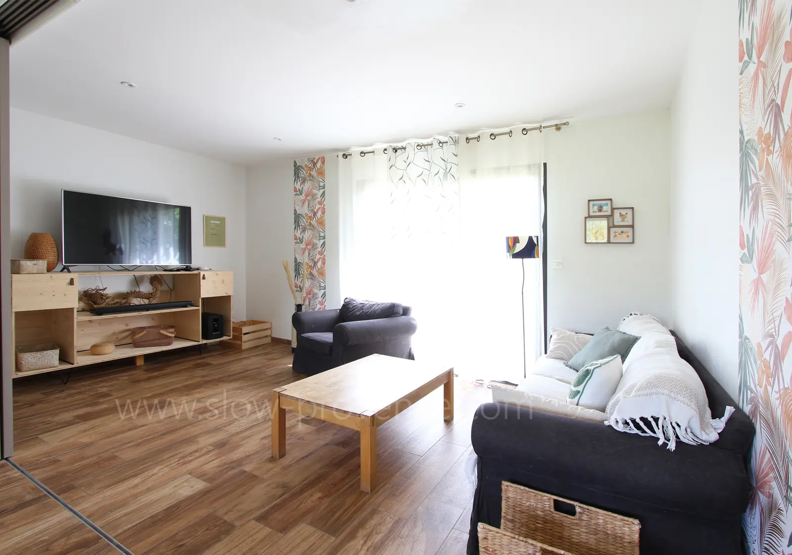 Grote, lichte woonkamer met toegang tot het terras op het noorden :
