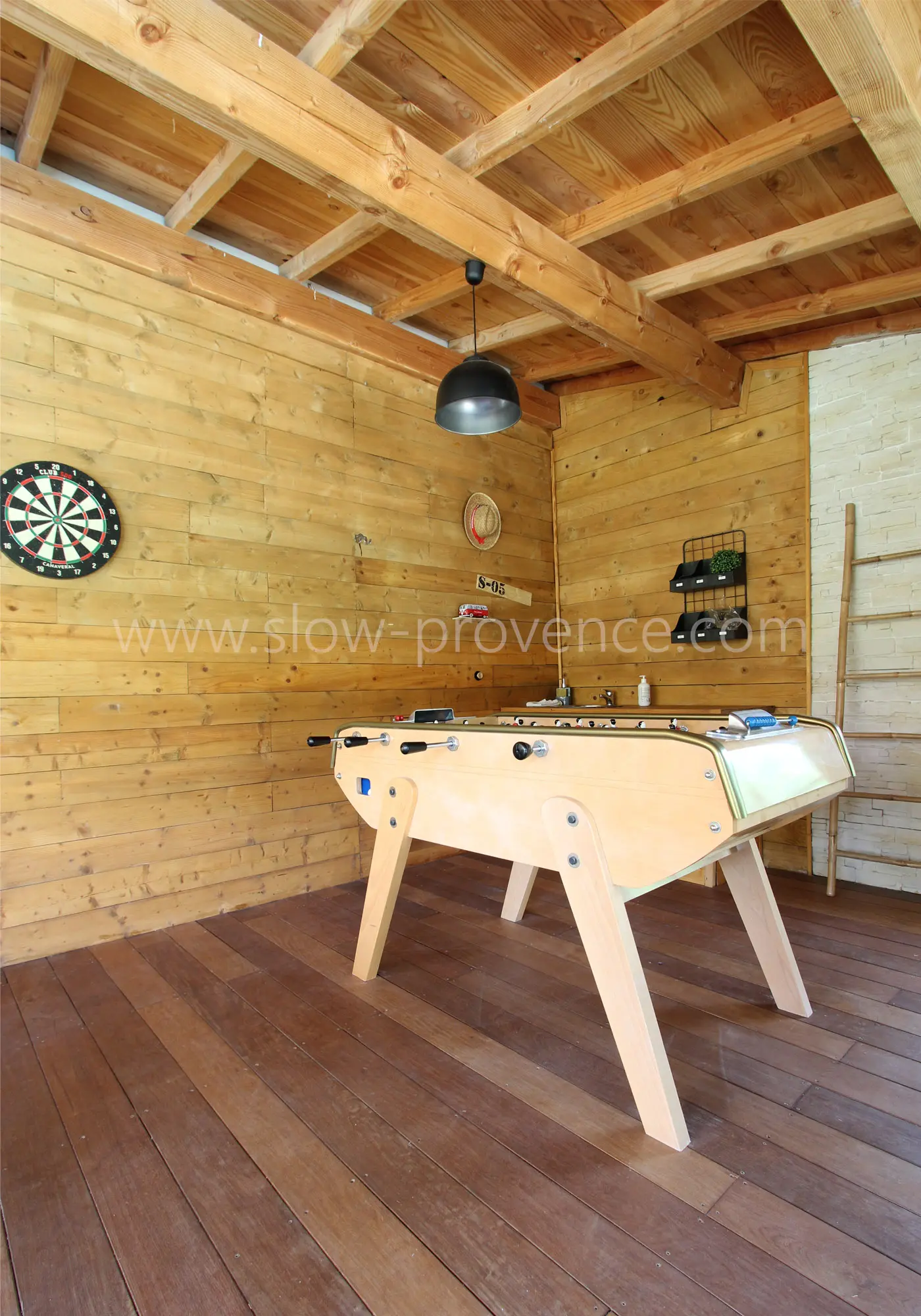 - Woonkamer : bank, fauteuil, salontafel, TV, tafelvoetbalspel;