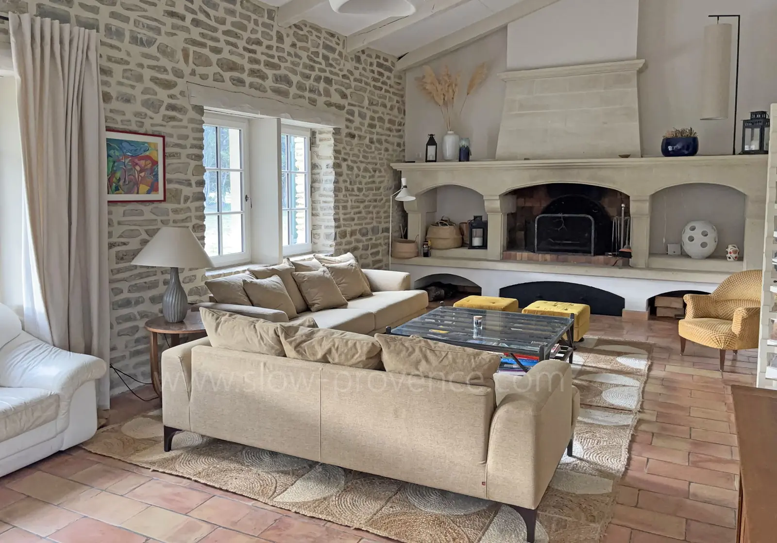 - Woonkamer 2 (aan de andere kant van de hal): 2 banken, fauteuil, 2 poefs, salontafel, grote open haard;