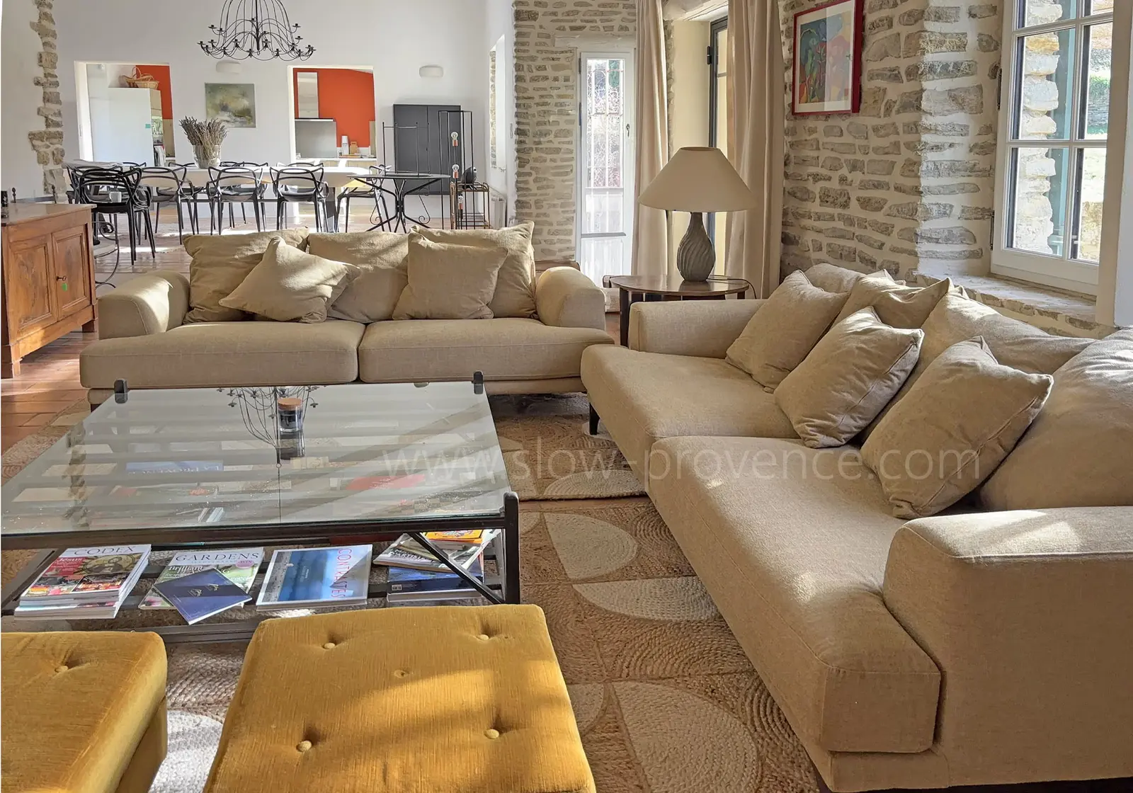 - Eetkamer (tussen twee terrassen, open naar woonkamer 2 en de keuken): grote tafel en 14 stoelen;