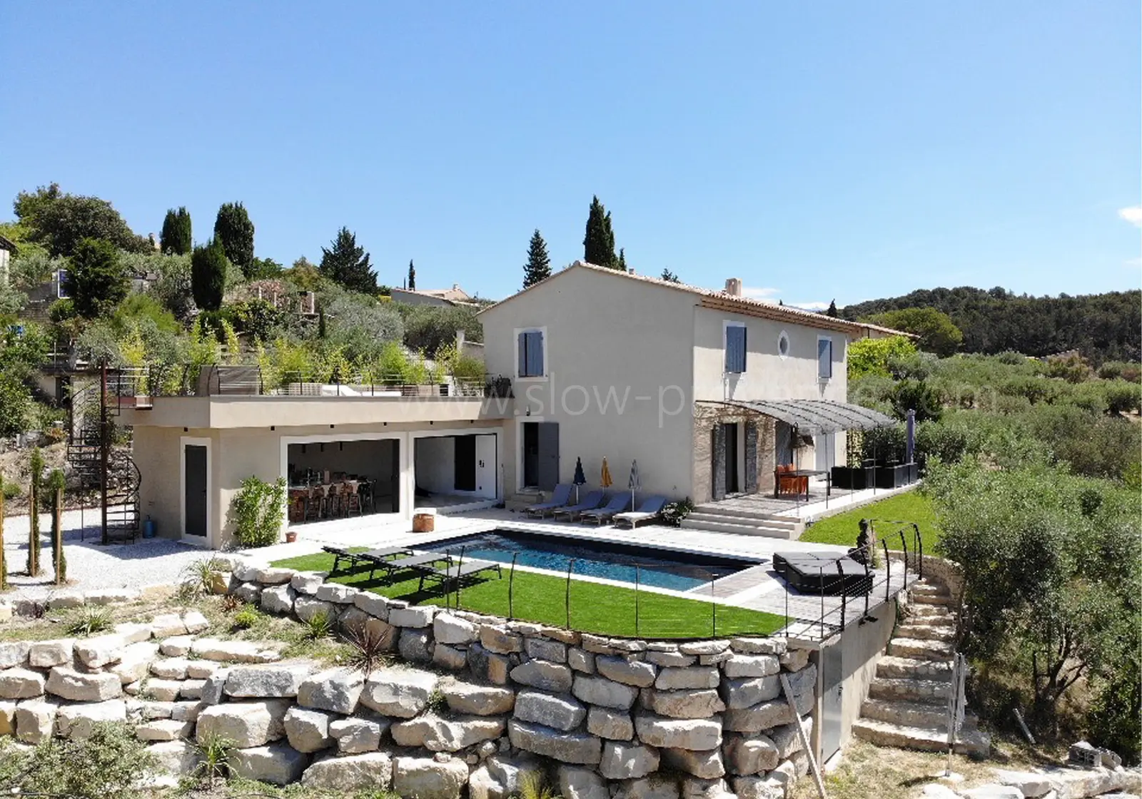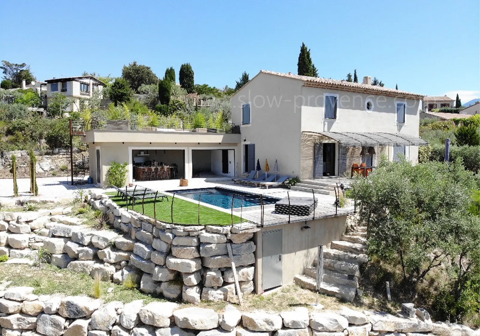 Aan het einde van een doodlopende straat op een heuvel, op 500 meter lopen van het middeleeuwse dorp Le Barroux , geniet dit prachtige vakantiehuis van een rustige en afgelegen locatie met een zeldzaam panoramisch uitzicht. De mediterrane tuin met terrassen, beplant met olijfbomen en hoge dennen , biedt een ongerepte natuurlijke omgeving , waar cicaden zingen en het steeds veranderende Provençaalse licht de boventoon voert. Het zwembad met panoramisch uitzicht , het poolhouse met een zomerkeuken en het dakterras om sterren te kijken, maken dit uitzonderlijke pand compleet, ideaal voor een ontspannende en verkwikkende vakantie tussen de Mont Ventoux en de Dentelles de Montmirail.