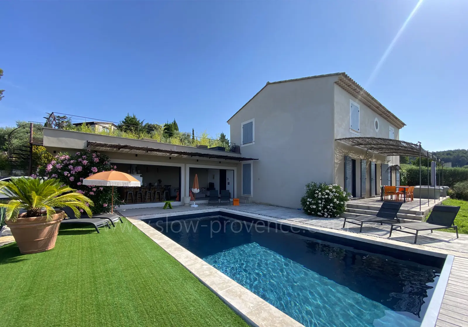 - Dakterras (boven het poolhouse): tuinmeubilair: grote bank, fauteuil, bar; prachtig uitzicht over de vallei en de sterrenhemel...
