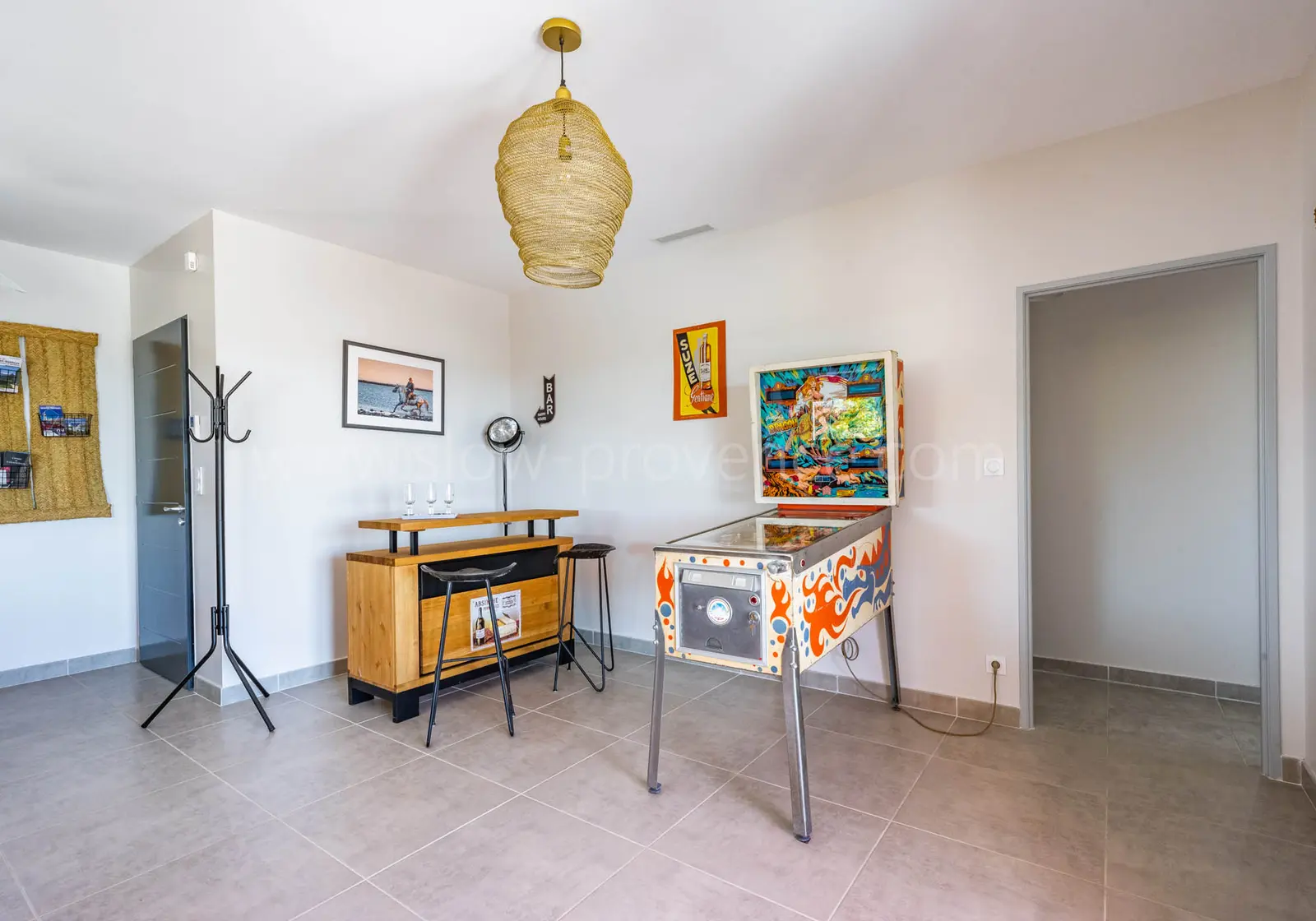 - Woonkamer : 3 banken, tv, bar met 2 hoge stoelen en flipperkast ;